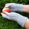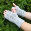 A pattern for knitted fingerless mittens. This pattern uses four stitches cable pattern and twisted knit stitches. The fingerless mitts are knitted from the top down. You’ll cast on almost at the tip of a pinky finger and finish at the cuff, using the backward loop cast on (the pattern has a link for reference) for the thumb gusset.