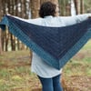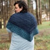 The shawl is a triangular shawl with slightly crescent upper corners, it is worked from the neckline down with the main color for the body and in contrast color for the border. The border connects to the live stitches of the body as it is worked.