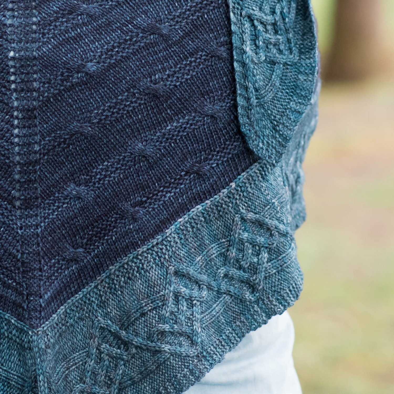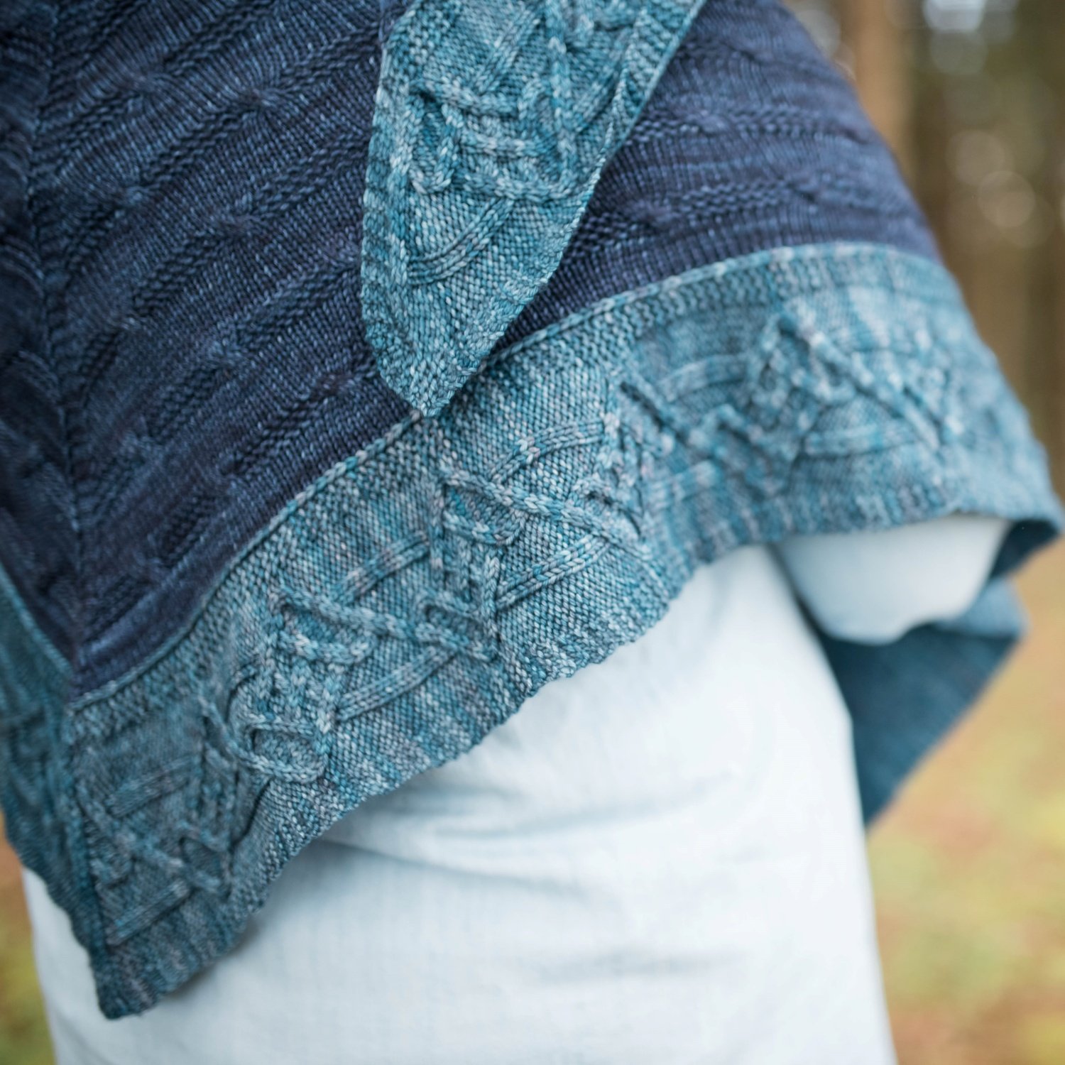 Crossing Twigs Shawl was inspired by trees in the winter. The cable motif of the border with lots of twists and turns is reminiscent of the look of the leafless trees when you can see many single branches and twigs and how they cross each other.