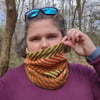 A pattern for a knitted cowl. Autumn’s Draft Cowl is inspired by the fall, the colors of the leaves, and how the wind blows them in all directions.