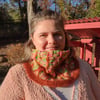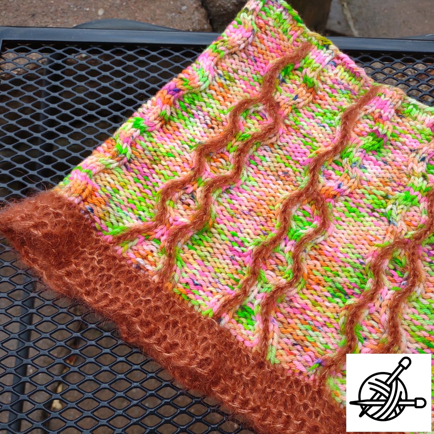 The pattern Rusty Keyhole Cowl brings together fun variegated colors of handdyed yarn with a fluffy texture of mohair yarn.